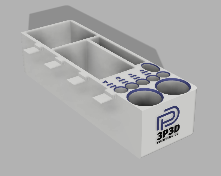 Designed specifically for a customer’s Bambu P1 setup, this bespoke tray provides organised storage for glue sticks, files, and pens — keeping their workspace clean and efficient. They were so impressed with the final design that they even requested our 3P3D Printing Co logo to be proudly featured on it!