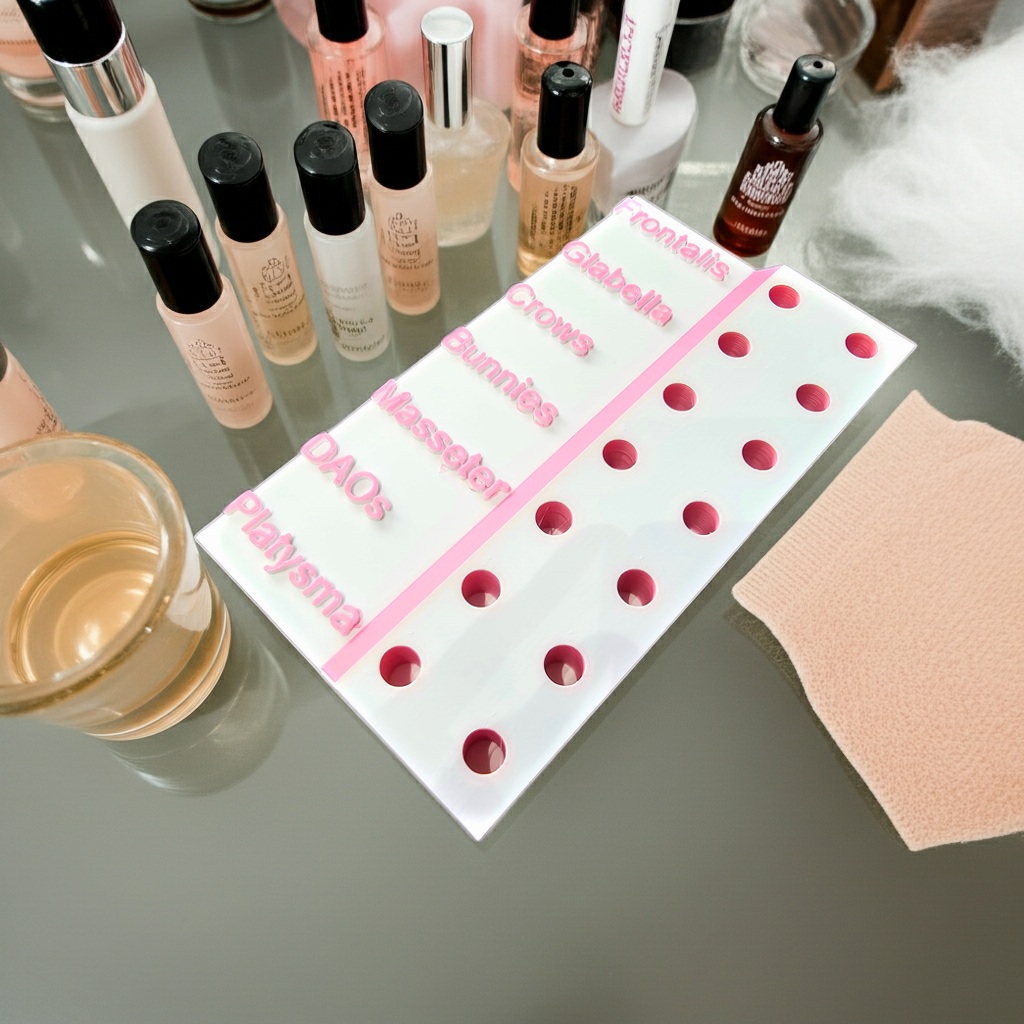 This elegant organiser features 7 clearly labelled treatment areas — Frontalis, Glabella, Crows, Bunnies, Masseter, DAOs, and Platysma — making it perfect for aesthetic practitioners, training academies, and beauty clinics.